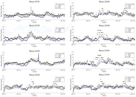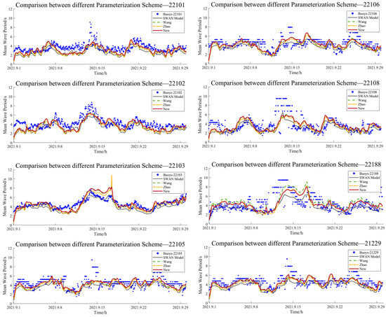 Among them, Toba’s scheme uses friction velocity , so we use Weisberg’s drag coefficient scheme of Equation (23) and to calculate the friction velocity . Other schemes will be used for fitting. In the fitted mean wave period elements, the wind speed and significant wave height data were used from the output data of the SWAN model. By comparing the data of eight KMA buoys, we obtain Figure 9.