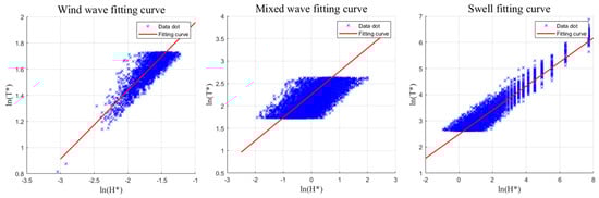 As Figure 10 shows, X is , Y is , the blue dots represent data nodes for fitting, and the red lines represent linear fitting lines. After fitting, the transformation relationship between the peak wave period and mean wave period is noted in (21).