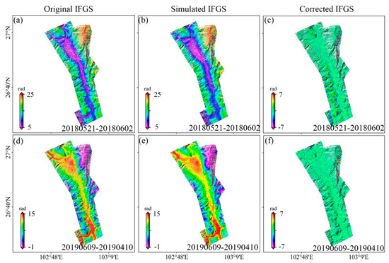 Typical interferometric phase correction results in the Baihetan area. (a,d) The original interferometric phase; (b,e) the model-simulated interferometric phase; (c,f) the corrected interferometric phase. The color bar represents the differential phases.