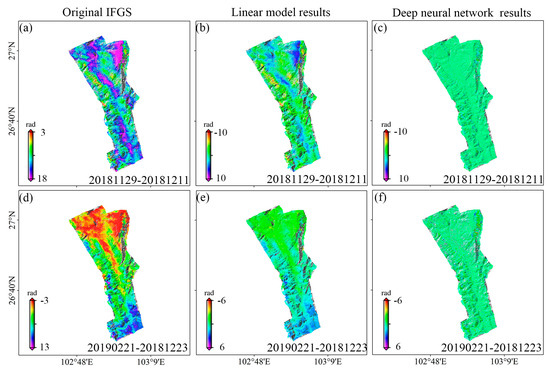 To validate the correction results of our method, we conducted a comparison with a traditional linear model atmospheric correction method. As shown in Figure 7, we present the results of the linear model and our deep neural network model corrections for two typical interferometric pairs in the Baihetan area. It is evident that after linear model correction, good correction results were obtained for some regions (Figure 7b,d) but the improvement is limited due to the spatial heterogeneity in atmospheric delay, which cannot be addressed using a specific model-based correction method [4,24,31], while clear global improvement was achieved (Figure 7c,f).