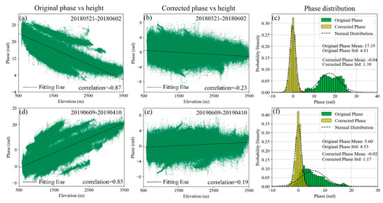 Statistics of before and after correction of typical interferometric phases in the Baihetan area. (a,d) Phase and topography correlation before correction; (b,e) phase and topography correlation after correction; (c,f) phase distribution before and after correction.