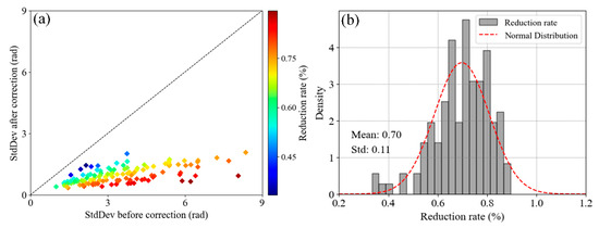 Statistics of phase StdDev before and after correction of all interferometric phases in the Baihetan area. (a) The result of the proportion of phase StdDev reduction for all interferometric phases; (b) the distribution of the proportion of StdDev reduction.