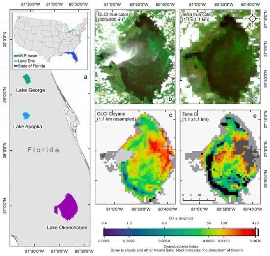 An example of failure due to the saturation of MODIS CI bands over intense cyanobacteria blooms in Lake Okeechobee on 2 July 2018. (a) Location of the studied lakes, with the main map showing Lakes, Okeechobee, Apopka, and George in Florida (area enclosed by the red rectangle in the inset), and the inset showing the contiguous United States with study areas highlighted—western Lake Erie (WLE) basin in turquoise, Lake Erie in light blue, and the state of Florida in blue. (b) True-color OLCI image at native resolution (300 m) showing the presence of cyanobacteria biomass in high concentration, (c) Resampled CIcyano from OLCI, (d) True-color Terra image, and (e) Terra CI; darker gray in the east-central part of Lake Okeechobee in Terra CI image indicates failure due to saturated pixels, which corresponds to the intense bloom area in the OLCI image. Light and medium gray colors indicate clouds and land. Black color in panels (c) and (e) indicates “non-detect”; insufficient cyanobacteria for detection by the algorithms (see Section 2.1 for more information).