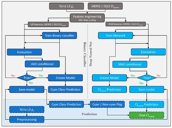 Schematic diagram showing CyanNet train/test and prediction workflow as carried out in this study. The left side of the figure, highlighted in blue, shows the Logistic Regression (LR) classifier workflow, and the right side, highlighted in turquoise, shows the fully connected Deep Neural Network (DNN) workflow. Final retrievals of CIcyano from CyanNet are highlighted in green. CyanNet-S for saturated pixels replicates the same workflow with different LR and DNN features listed in Table 2.