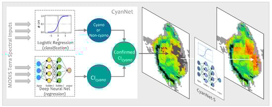 We designed the CyanNet framework by combining two models—A Logistic Regression (LR) classifier and a Deep Neural Network (DNN). LR model component uses 17 MODIS Terra spectral features (ρs and other derived features) to classify a pixel as a cyanobacteria pixel or a non-cyanobacteria. On the other hand, DNN uses 12 spectral features (ρs and other derived features) to predict the magnitude of CIcyano at the cyanobacteria classified pixel (Table 2). To address the MODIS band saturation issue over bright targets, we created a replicate of the CyanNet, CyanNet-S, that does not use the bands that saturate (Table 2). By design, CyanNet-S skips the red-NIR bands that tend to saturate over bright targets and returns a CIcyano retrieval over the saturated pixels when the standard CyanNet fails. While the CyanNet covers a full range of cyanobacteria concentrations, CyanNet-S typically only needs to address high-concentration biomass (where the bands saturate). Model components of the CyanNet framework are briefly discussed below.