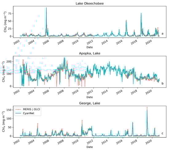 Comparison between MERIS/OLCI derived 10-day composite Chl-a time series and that from Terra with CyanNet in (a) Lake Okeechobee, (b) Lake Apopka, and (c) Lake George in Florida.