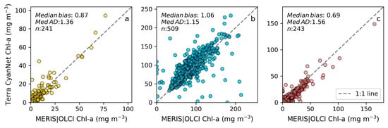 We processed the entire time series of MERIS (2002–2011) and OLCI (2016–2020) data, mimicking an operational lake monitoring setup for CyanNet’s skill assessment. Intentionally, we did not screen nor omit daily MODIS-Terra data due to cloud cover or sun glint contamination. Therefore, the performance of CyanNet presented here shows the worst-case scenario. Most of the differences were observed in the low range, where the differences are due to: