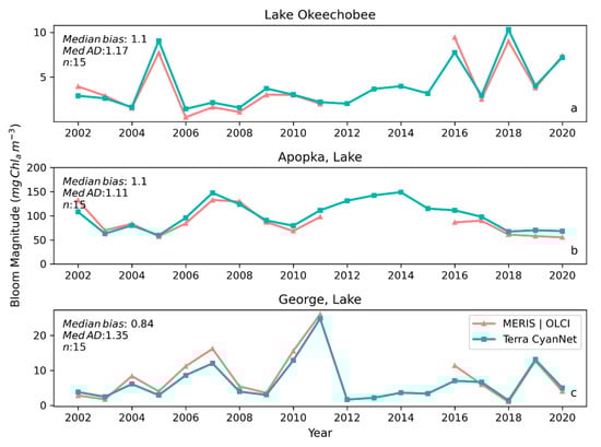 Validation with annual bloom magnitudes observed from MERIS and OLCI 10-day time series and Terra-CyanNet 10-day composite time series in (a) Lake Okeechobee and (b) Lake Apopka and Lake George (surrounded by dashed gray rectangle).