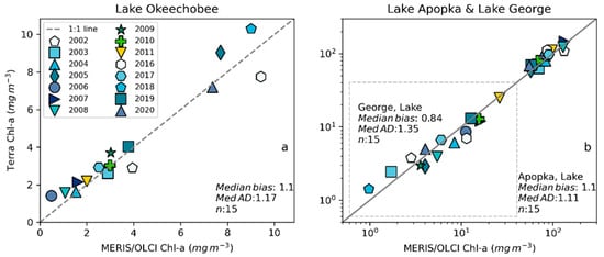 The invalid data fraction (%) difference between Terra and MERIS/OLCI significantly contributed to the MedAD between the two products (Figure S2). As expected, the sensor time series with more valid data tends to have a higher accumulated Chl-a. Therefore, in an ideal situation with the same spatial coverage from MERIS/MODIS and OCLI/MODIS, the degree of match-up would be better than in the current scenario. For example, in Lake George, out of 243 composites, only 72 composites had near-complete valid data (<1% difference in invalid data fraction between the two different time series). Nevertheless, a match-up with the selected data (<1% difference) improved the MedAD from 56% with 30% negative bias in all data to 17% with 10% negative bias (Figure S3c). Improvement in the match-up corroborates that valid data availability is critical in validating or comparing cyanobacteria Chl-a biomass from two sensors with different spatial resolutions and revisit times. It should be noted in the same analysis that match-up performance did not change in Lake Apopka, as the difference in valid data availability is not an issue in that lake. Less than 10% of composites had a difference of ≥ 1% in invalid data coverage (Figure 6b, Figures S2 and S3). However, the MedAD in Lake Okeechobee increased in the selected match-up dataset (with <1% difference in invalid data coverage) from 36% in all composites to 58%. That is primarily because out of 23 composites, 20 had less than 2 mg m−3 Chl-a, and the other two had a mean Chl-a concentration of 2–5 mg m−3. As discussed earlier, percent difference is not a good metric for evaluating the difference in the low end, as a meaningless difference could cause a very high percent error. Moreover, Chl-a retrievals below 2 mg m−3 would remain in the algorithm uncertainty range [].