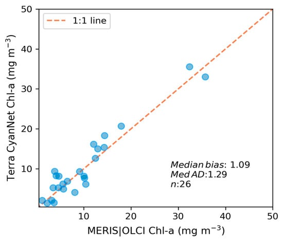 We transferred CyanNet to western Lake Erie without further regional training and validation. We evaluated the model with 26 daily CIcyano image pairs from MERIS/OLCI and Terra-CyanNet. CIcyano spatial patterns from CyanNet matched very well with MERIS/OLCI (Figure 10). However, some discrepancy in the lower end of CIcyano is visible, potentially due to a cyano-flagging issue. For example, the MERIS CIcyano product misses low-biomass pixels due to more conservative cyan/non-cyan flagging by the 665 nm shape in the CIcyano algorithm (Figure 10a, red annotated area). In contrast, the CyanNet LR classifier classifies those pixels as valid cyan pixels. Similarly, low-biomass OLCI CIcyano pixels from 23 September 2017, in the same area are flagged by potential land adjacency. CyanNet keeps those pixels as valid data, as CyanNet does not use the land adjacency flag. On 18 August 2022, the data show how CyanNet could lose low-biomass CIcyano pixels, classified as non-cyan pixels. On the same day, OLCI CIcyano identified the low-biomass bloom area (Figure 10c,f, red annotated area). With all these discrepancies in the low end, quantitatively, daily mean Chl-a concentrations from MERIS/OLCI and Terra differed by 29% with a 9% positive bias (Figure 11).