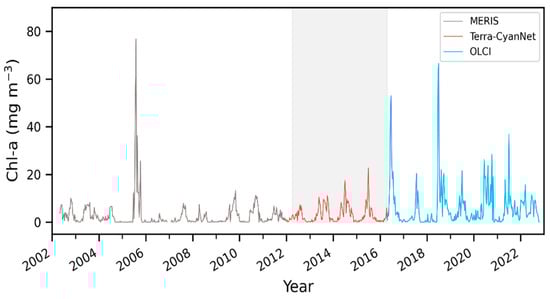 21 years of continuous and consistent 10-day Chl-a timeseries from MERIS, MODIS, and OLCI in Lake Okeechobee. Shaded region shows the satellite observation discontinuity between MERIS and OLCI.