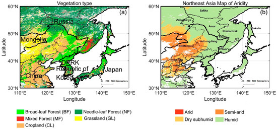 Figure 1. (a) Distribution of vegetation, and (b) dry and wet regions of northeast Asia.