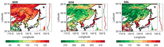 Figure 2. Spatial patterns of long-term averaged (a) SOS, (b) EOS, and (c) GSL.
