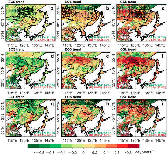 Figure 3. Spatial distribution trend of SOS, EOS, and GSL during different time periods in northeast Asia (A and D represent the proportions of advanced and delayed pixels, respectively, and the black dots show the pixels with statistically significant phenological trends when p < 0.05. (ac) represent the spatial distribution diagrams of the temporal change trends of spring and autumn phenology and growth season duration from 1982 to 2014, respectively; (df) represent the spring and autumn phenology and growth season duration from 1982 to 1998, respectively; (gi) represent the spatial distribution diagrams of the temporal change trend of the spring and autumn phenology and the duration of the growing season from 1999 to 2014, respectively).