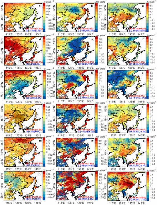 The change trends of the SOS and EOS pre-season climatic factors in different time periods in northeast Asia show obvious changes in time and space scales. On the time scale, the proportion of the SOS pre-season precipitation showed a significant delay trend during the three periods of 13.6%, 19.5%, and 0.2%, respectively, whereas the proportion of the SOS pre-season precipitation showed a significant advancement trend of 2.5%, 0.6%, and 1.3%, respectively (Figure 4b,e,h).