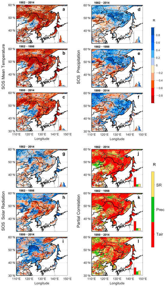 To understand the SOS’s relative contribution rate of pre-season climatic factors in different periods and different vegetation types on a spatial scale, we analyzed the partial correlation of climatic factors on a pixel-by-pixel basis, and compared the size of the partial correlation coefficient of the SOS and climatic factors (Figure 5). We established that the spatial difference of the forest as a result of the pre-season temperature was also large; for example, in the needle-leaf forest in the inland region of the far east of Russia (Sakha region of Russia), the main limiting factors for the delay of the SOS during the period of 1982–1998 were temperature and precipitation. The increase in water and heat caused a delay in the SOS in the needle-leaf forest, which was restricted by radiation during the period of 1999–2014. The reduction in radiation resulted in the advancement of vegetation phenology. Another example is broad-leaved forests distributed in the eastern part of northeast China, the DPRK, and Japan (Liaoning, Jilin, the coastal areas of the Okhotsk Sea in Heilongjiang in China, and in Russia). The SOS was restricted by the pre-season temperature [45]. The increase in the pre-season temperature during 1982–1998 caused advancement of the SOS (Figure 5b), and a decrease in the pre-season temperature during 1999–2014 caused a delay in the SOS (Figure 5c).