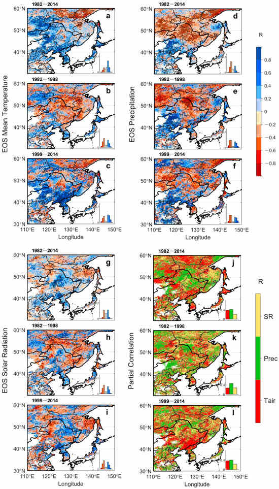 Figure 6. The spatial distribution and relative contribution diagrams of partial correlation between autumn vegetation phenology and pre-season climatic factors during different time periods in northeast Asia. (ac) represent pre-season temperatures; (df) represent pre-season precipitation; (gi) represent pre-season radiation; and (jl) represent the relative contribution of climatic factors to spring vegetation phenology during three time periods. Black dots represent significance.