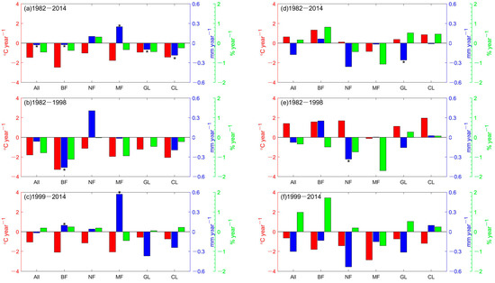 Compared with the overall trend of the SOS in different regions, the advancement trend of broad-leaved forests was the most evident during 1982–1998, accounting for 86.8%, and the delayed trend was the most evident during 1999–2014, accounting for 49.3% (Figure S3a). The delayed trend of the EOS in various types of broad-leaved forests was the most evident during 1982–1998 and 1999–2014, with 67.3%, and the advancement trend of needle-leaf forests was the most evident during 1999–2014, accounting for 51.8% (Figure S3b). During the period of 1999–2014, the delayed trend of the GLS in all regions was between 30 and 50%, and during the period of 1982–1998, the advancement trend of the GLS in all regions was between 65 and 85% (Figure S3c).