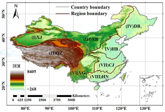 Mainland China, with its diverse natural and climatic geomorphic units, provides an ideal case study area for evaluating the accuracy of reanalysis precipitation products. In this study, mainland China is utilized as the research domain, which encompasses a latitudinal and longitudinal range of 73°40′–135°02′E and 18°10′–53°33′N, respectively. The distribution of the topography is depicted in Figure 1. Referring to Chen’s study [], eight subregions are defined based on the distribution of mean annual precipitation, elevation, and mountain range orientation, including (I) Xinjiang region (XJ) in far-west China, (II) the high-elevation Qinghai–Tibetan Plateau region (QZ), (III) the northwestern region (XB), (IV) the region north of the Yanshan Mountains in northeastern China (DB), (V) the northern part of China, north of the Huaihe River and north of the Qinling Mountains (HB), (VI) the southwestern Yunnan–Guizhou Plateau region (YG), (VII) the Yangtze River Plain region (CJ), and (VIII) the southeastern region of China (HN).