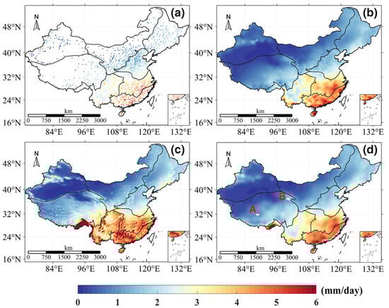 It is important to note that the CRA40 precipitation product lacks sea surface precipitation information, resulting in data gaps in coastal areas. Moreover, there are also missing data for some grids within China, the number of missing grids increases further after bilinear interpolation, and the missing grid areas are indicated by the red letters A and B in Figure 2d. In order to mitigate the impact of missing CRA40 values on the assessment results, 1950 station observations (referred to as the gauges) containing valid CRA40 values were selected from 2301 rain gauge station observations as the reference data for subsequent calculations and analyses.