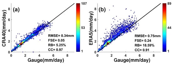 The scatter density plot of Gauge versus (a) CRA40, (b) ERA5.