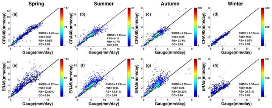 (a–d) Scatterplots of seasonal daily precipitation densities for CRA40 versus Gauge in spring, summer, autumn and winter. (e–h) Scatterplot of seasonal daily precipitation densities for ERA5 product versus Gauge in spring, summer, autumn, and winter. The colors indicate frequency of occurrence.