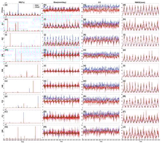 Daily variations of precipitation in terms of RB, bias, CC and RMSE for (a–d) China, (e–h) XJ, (i–l) QZ, (m–p) XB, (q–t) DB, (u–x) HB, (y,z), and (A,B) YG, (C–F) CJ, and (G–J) HN regions. The vertical axis scales for each subregion were adjusted based on the maximum values of the y-axis in different subpanels.