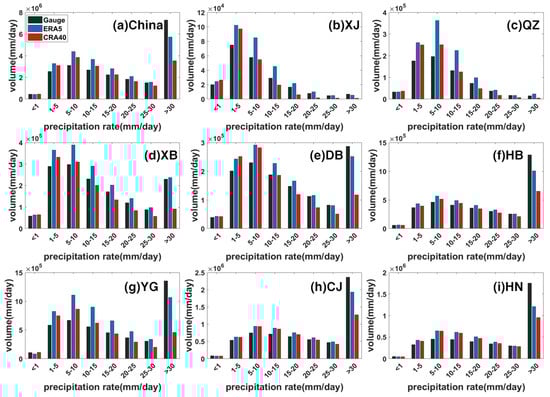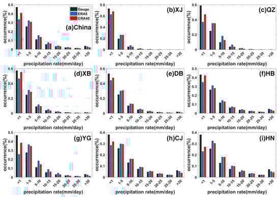 In addition, when precipitation rates are less than 1 mm/day, the precipitation amounts from the two reanalysis precipitation products are more consistent with the rain gauge observations. At precipitation rates from 1 mm/day to 30 mm/day, ERA5 estimated more precipitation than rain gauges, and CRA40 performs relatively better than ERA5, which is consistent with the precipitation shown in Figure 2. However, at precipitation rates greater than 30 mm/day, these two reanalysis precipitation products estimate less precipitation than the rain gauges, except for areas XJ, QZ, and XB, where the ERA5 estimates precipitation more closely aligned with the gauge observations. This result suggests that both CRA40 and ERA5 underestimate the amount of precipitation for sporadic and heavy precipitation, and overestimate the amount of precipitation for light and medium precipitation, while CRA40 significantly underestimates the amount of precipitation for heavy precipitation. In summary, in the precipitation detection of China and its eight subregions, CRA40 has better precipitation detection performance when the precipitation rate is lower than 30 mm/day. When the precipitation rate is greater than 30 mm/day, the detection performance of ERA5 is better.