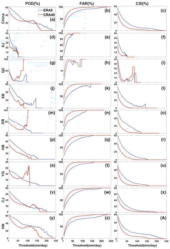 Contingency metrics for precipitation POD, FAR, and CSI in (a–c) China, (d–f) XJ, (g–i) QZ, (j–l) XB, (m–o) DB, (p–r) HB, (s–u) YG, (v–x) CJ and (y,z,A) HN regions. The vertical axis coordinate scale is set according to the maximum value of the y-axis in different subpanels.