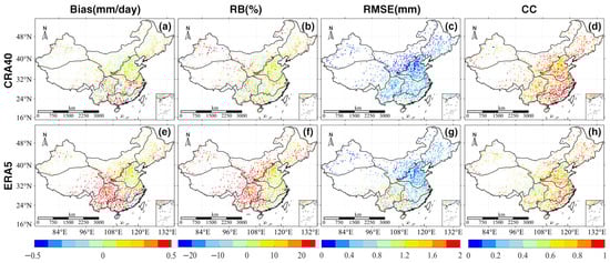 Spatial distribution of bias, RB, RMSE, and CC for (a–d) CRA40 and (e–h) ERA5 in China.