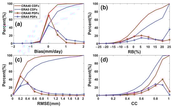 Probability (cumulative) distribution function PDFc (CDFc) for (a) bias, (b) RB, (c) RMSE, and (d) CC values based on the results calculated in Figure 10.