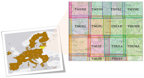 The 13 Sentinel-2 tiles used in the present study covering Lithuania.