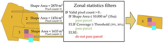 Then, two distinct conditions are imposed in order to retain the relevant components. The SOC map will retain portions that are >1 ha and have a coverage of at least 70%, while the clay map will retain parcels that are greater than 1 ha and have coverage ≥ 30%. The choice of these percentages was made based on our expertise and under the reality that SOC presents greater variability within the parcel compared to clay, and that is why the SOC percentage is more strict. We considered it misleading to give final values to parcels for which the area is >1 ha but the total number of pixels within the polygon is poor (e.g., 5 pixels). For explanation purposes, we created the example of Figure 3, where zonal-statistics-filtered parcels with a pseudocode explanation are provided.