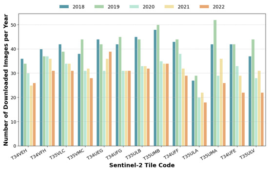 A total of 2262 Sentinel-2 images were ingested into the SDC, corresponding to approximately 5 terabytes, which cover Lithuania from 2018 to 2022 (5-year period) from March to October. Figure 4 demonstrates the number of images that were automatically downloaded for each year and per tile. The main reason behind the variance in the file counts per year is the cloud coverage filter of the SDC that assures that overcast scenes (i.e., with cloud coverage >30%) will not be further processed.