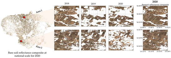 Furthermore, and considering that the final maps have been generated at the national level, it is impossible to visualize in detail the results at such a large scale. For this reason it was deemed necessary to focus on smaller-scale demonstration areas, to make it easier for the reader’s eyes but also for drawing conclusions. Two demonstration areas were chosen: area 1 in the north of the country and area 2 in the south. Figure 7 demonstrates the location of these areas and provides the zoomed bare-soil reflectance composite maps. In both areas, the annual map of 2018 is more crowded compared to the next two years, which is mainly due to the cloudy/snowy conditions that did not allow the detection of more bare-soil pixels. However, here we must highlight the advantage of this three-year median value methodology to provide more detailed information.