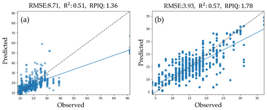 Scatterplot of the CNN prediction results for (a) SOC (g/kg) and (b) clay (%). The dashed line is the 1:1 line, while the straight line is the least squares regression line.