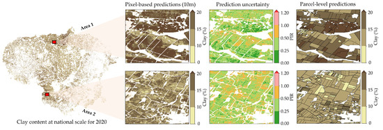 The recognized importance of sustainable soil carbon sequestration practices to contribute to climate change mitigation [35] has led to various applications of satellite EO data, demonstrating the benefits of EO-driven soil spatial products (reference). Two of the most widely monitored soil properties via EO are the soil organic carbon (SOC) and the clay content [36,37]. SOC is essential for a variety of soil processes and ecosystem services, plays a crucial part in the global carbon cycle, and is a topic of scientific interest in the context of climate change [38,39]. Estimating the geographical distribution of SOC content is essential for directing land management to improve soil health by reducing carbon emissions and sequestering C [40]. It may be significantly altered over the years due to crop practices. Soil clay content refers to the proportion of fine particles in the soil, and is one of the three soil particles that contribute to the soil’s texture (the other two being sand and silt particles). It is of crucial importance for soil health, influencing a soil’s fertility, water-holding capacity, nutrient availability, and overall soil structure, ultimately affecting plant growth and ecosystem functioning [41]. The clay content of soil typically does not change rapidly or frequently in natural conditions, being primarily determined by factors such as the parent material, weathering processes, and the geological history of the area. However, human activities, such as land management practices, can alter the clay content over longer periods of time; for example, excessive tilling or erosion can lead to a loss of topsoil, which may reduce the clay content.