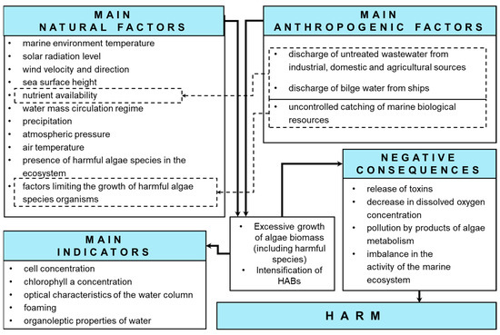 Based on the analysis of the above publications, an integrated generalizing scheme was compiled containing some of the main factors and indicators directly accompanying HABs, as well as their negative consequences (Figure 1).