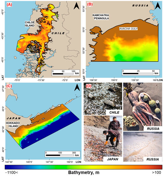 The studied water areas. (A) Near the island of Chiloe (Chile), (B) Avacha Bay adjacent to the Kamchatka Peninsula (Russia), (C) near the island of Hokkaido (Japan). (D) Examples of the consequences of HABs in these areas.