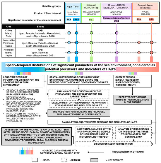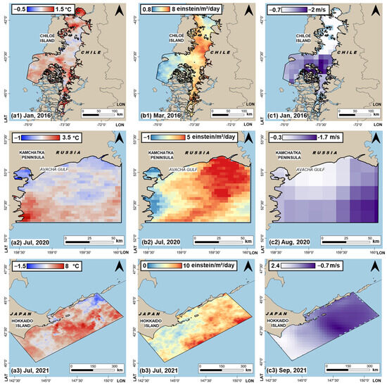 The purpose of this study is to analyze long-term time series of satellite and model data on the natural conditions of the environment where the three above-mentioned intense HABs occurred (off the island of Chiloe (Chile), adjacent to the Kamchatka Peninsula (Russia), and off the island of Hokkaido (Japan)), in the interest of the following:
