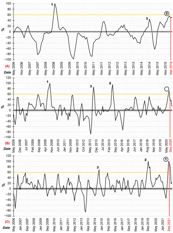 The value was often used in attempts to identify short-period anomalies of the studied parameters [5,8,63,64], but the informativeness of this criterion is limited. Therefore, this study also included criteria and [19,65].