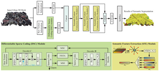 where, here, minimizes a sparse representation problem . The outputs of this DSC module are sparse codes of raw texture information, which are concatenated with geometrical information g of the urban 3D mesh and input into later SFE modules, and associated semantic segmentation loss , which is used to calculate the loss between predict labels and ground-truth labels c. Here, the model parameters of semantic urban 3D mesh segmentation are absorbed in as an argument.