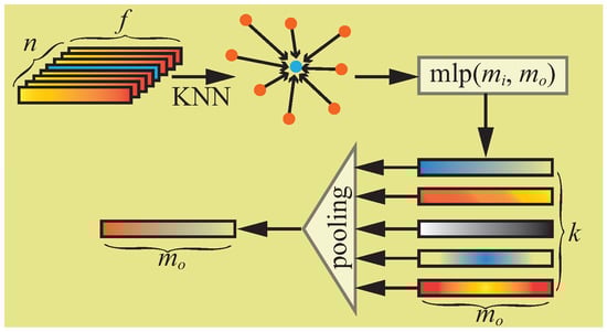 The purpose of the cascade of the prior DSC module in our architecture is to obtain low-intrinsic-dimensional data, which are good identifiable features for semantic urban 3D mesh segmentation, from raw texture images. The prior steps from Algorithm 1 must be flexible enough to learn the low-intrinsic-dimensional data from raw texture images but also project on a subset according to the semantic urban 3D mesh segmentation loss . The obtained low-intrinsic-dimensional data (i.e., sparse codes of raw texture images) are concatenated with geometrical information g of the urban 3D mesh and input into the later SFE to get high-level semantic features. In this paper, we construct the SFE module using the CoGP-based method. The architecture of the SFE module is shown in Figure 3. Every facet within an urban 3D mesh is represented by a CoGP with features consisting of the corresponding sparse codes of raw texture images, the coordinates of the CoGP, and the normal vector of the facet. In order to learn the local features of the urban 3D mesh, we apply the knn method to build a directed graph per CoGP, and propose an edge convolution method performing on the direction graphs. At last, the outputs of edge convolution are aggregated by using a symmetry function. The details are described as follows.