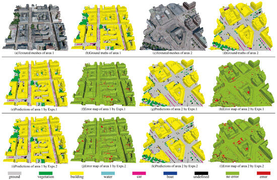 Results of the semantic 3D mesh segmentation on the validation dataset with Exps.1 and Exps.2.