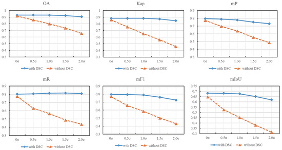 The proposed MeshNet-SP has higher robustness for semantic urban 3D mesh segmentation under varying levels of texture image noise. In order to evaluate the robustness of the proposed MeshNet-SP, four experiments (i.e., Exps.3∼Exps.6) are set. In Exps.3 and Exps.4, the DSC subnetwork is applied to get low-intrinsic-dimensional data, while Exps.5 and Exps.6 are without such a subnetwork. The experiments involve the addition of varying levels of noise, such as 1× standard deviation (1) and 2× standard deviation (2), which follow a Gaussian distribution, to the raw texture images. The results in Table 2 and Figure 8 and Figure 9 validate the effectiveness of our proposed MeshNet-SP to obtain low-intrinsic-dimensional data from raw/noised texture images to improve the accuracy of the semantic 3D mesh segmentation. We can see in Table 2 and Figure 8 that while the accuracy of the models without the DSC subnetwork drastically decreases over the 0∼2 noise levels, the accuracy of our proposed MeshNet-SP remains stable. Specifically, from 0 to 2, the accuracy of the models without the DSC subnetwork decreases by ∼30%, where the Kappa coefficient decreases by ∼41%. The primary factor contributing to the decline in the accuracy of the model without the DSC subnetwork is the presence of noise in texture image data, which can result in an increase in its intrinsic dimensionality. However, the proposed MeshNet-SP can still effectively obtain low-intrinsic-dimensional data through the utilization of the DSC subnetwork. From the partial visualization results (see Figure 10) and the normalized confusion matrices (see Figure 9), we can see that as noise levels increase, the number of misclassification in the water, car, and boat classes increases dramatically in Exps.5 and Exps.6 due to the absence of the DSC subnetwork. Meanwhile in Exps.3 and Exps.4 with the DSC subnetwork, as noise levels increase, the increase of misclassification of water, car, and boat classes is relatively small. These results validate that the DSC subnetwork producing low-intrinsic-dimensional data obtained can make MeshNet-SP more robust.