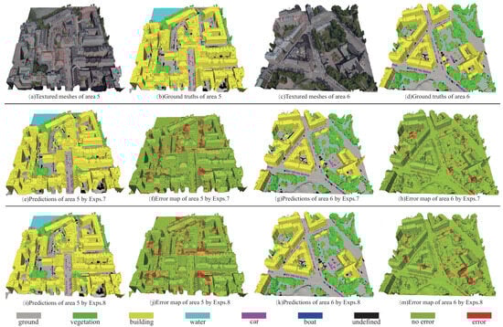 Results of the semantic 3D mesh segmentation on the validation dataset with Exps.7 and Exps.8.