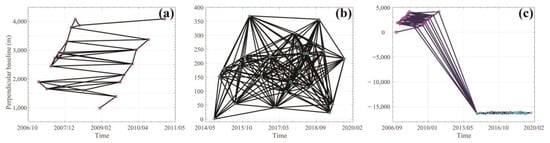 Spatiotemporal baseline of SBAS-InSAR method with ALOS-1 PALSAR-1 and ALOS-2 PALSAR-2 datasets. The different color and shapes present the acquisition of SAR images at different datasets. (a) Baseline network of interferograms from ALOS-1 datasets. (b) Baseline network of interferograms from ALOS-2 datasets. (c) Baseline network used to link the time series for ALOS-1/2 datasets.
