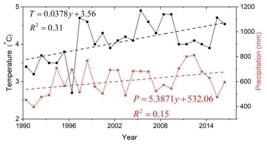 Temperature and precipitation changes during 1990–2016 at the Nyalam station (~17 km away from the study area). T represents temperature in °C, y represents year, and P represents precipitation in mm.