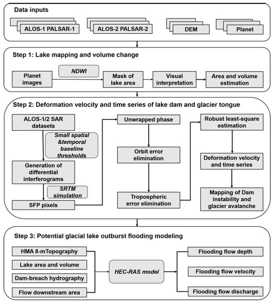 We synergized ALOS-1 PALSAR-1 and ALOS-2 PALSAR-2 data, optical Planet-based data, and the thickness change products to assess GLOF hazard using multiple remote sensing methods. Thereafter, we modeled the lake flooding processes based on HEC-RAS. The flowchart for multiple remote sensing methods and the hydrodynamic model is shown in Figure 4.