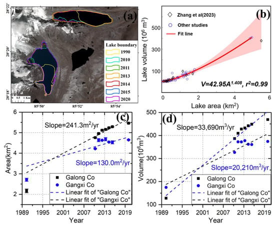 Area and volume expansion of Galong Co and Gangxi Co from 1990 to 2020. (a) The lake changes of Galong Co and Gangxi Co during 1990–2020. (b) The empirical relationship between lake area and volume proposed by Zhang et al. [] (c) The area expansion of Galong Co and Gangxi Co. (d) The volume expansion of Galong Co and Gangxi Co.